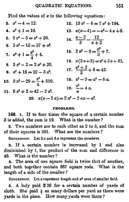 It has been said that one needs to go to an American college in order to get a high school education. The nog and wog mud factors have now insured that one needs college in order to get a grammar school education. I ask you to peruse this page from a book titled Elements of Algebra: A Course for Grammar School, 1894. It was published by the American Book Company and written by the then president of NYS Normal College at Albany, New York. The Normal College network was a publicly funded organization which was the predecessor to the present State University of New York. Although well rated, these schools were not noted for 'top shelf' education.