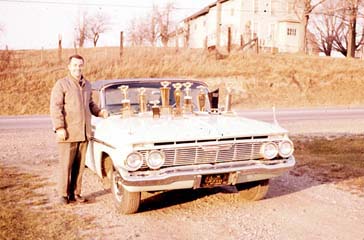 Here is yours truly standing in his driveway -- autumn 1961 -- showing off a few of his trophies.