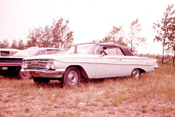 OK folks! Here's my 1961 Chevy 283 cid V8 convertible taken at Jackson drag strip in the summer of 1961. Notice the newly acquired trophy resting upon the hood. It was a Class "E" stock entry which dominated the drags in my neck of the woods for about 2 years. I generally whipped over the 1/4 mile finish line at 88 mph and in the low 14 second bracket. On the highway, I could get 26 mpg at 70 mph. It was a great car which cost me the magnificent sum of $2600 new. Gasoline was selling for 22 cents per gallon at the time. After grinding out 188,000 trouble-free miles, I gave it to one of my brothers.