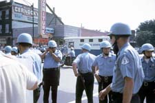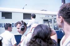 The room contained about 20 people all busily engaged in screen printing "White Power" T-shirts and posters. We helped for a while and were paid off in merchandise. At this time, Rockwell announced that he was off to the park and that we should join him in about 15 minutes. I stuffed the posters and T-shirts into the trunk of my car and walked two blocks to the crowd which was plainly visible at the edge of the park. We arrived only to find that Rockwell had been handcuffed and loaded into a paddy wagon. These 4 frames are of that moment and reporters can be seen talking to Rockwell who was behind the wire mesh. Although several hundreds of White people rallied at the park, the local news media announced that "a few of the curious showed up."