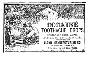 The advertisement comes from a time when cocaine 1, a tincture prepared from the leaves of the coca plant, was carried in stock by all pharmacies and available to any purchaser. It was generally used as an analgesic and local anaesthetic in ophthalmology and dentistry, where compounds of it are still employed. The cocaine drops here advertised were undoubtedly effective and infallibly relieved toothache; a small vial of them was certainly worth the cost, fifteen cents (real money, not the intrinsically worthless trading stamps printed by the fraud called the Federal Reserve). If the drops were now available, I would suggest that you keep some on hand.